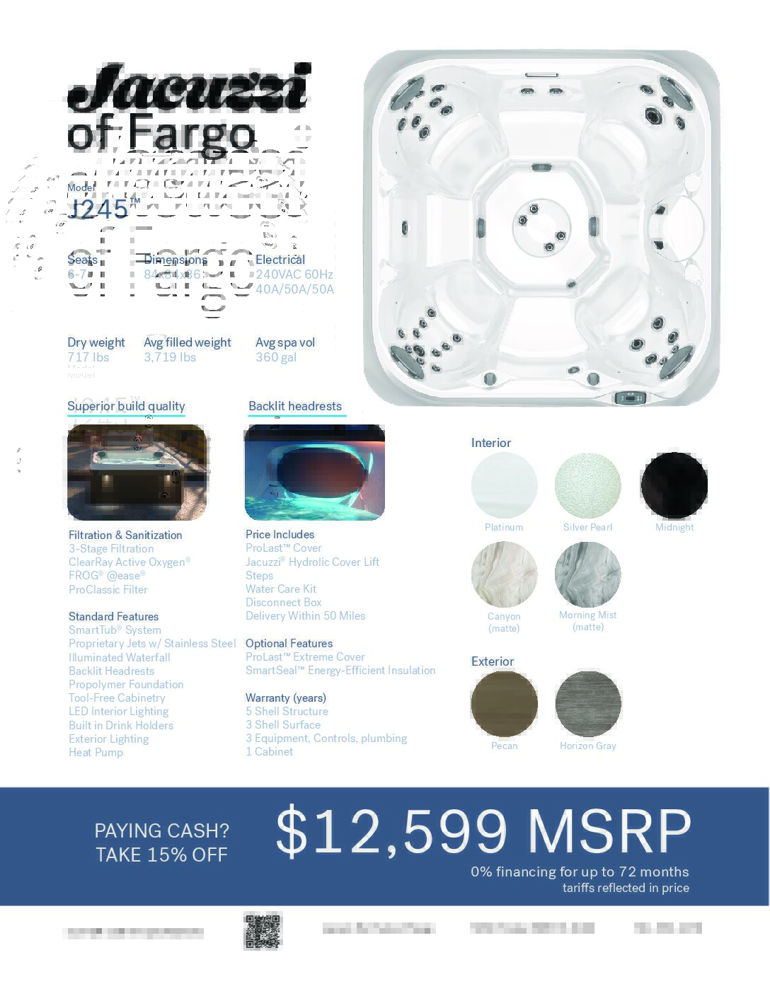 This value spa also includes LED lighting and an open-seating arrangement to ensure rest and relaxation for all. In addition to our impressive selection of hot tub models, we also feature a variety of Jacuzzi® Hot Tub accessories to further enhance your spa experience.